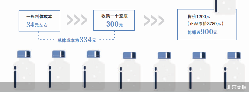 既能生产料体又有渠道资源,老杨的生意“风生水起”。老杨算了一笔账,“680元一公斤的黑绷带能装20个空瓶(50ml),一瓶料体的成本在34元左右,加上收购空瓶的300元,总体成本为334元,就算用低于正品一半多的价格1200元(正品原价3780元)卖出去,也能赚近900元。