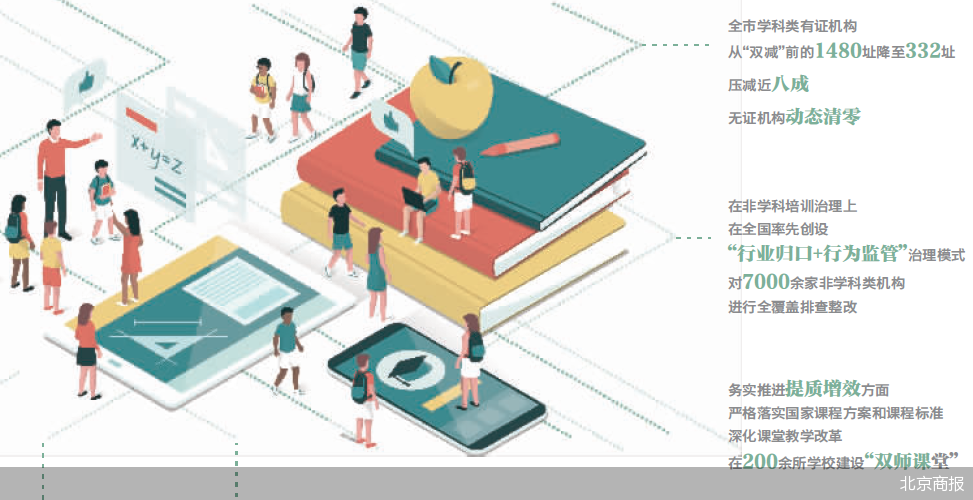 完善政策保障体系方面,中央出台《关于进一步减轻义务教育阶段学生作业负担和校外培训负担的意见》后,北京市在全国率先制定落实措施和文件,先后颁布《治理违规学科培训工作指引》《学科类校外培训机构指导手册》《关于非学科类营利性培训机构准入工作的衔接意见》等20余个配套治理文件,还率先出台了课后服务教师绩效激励经费保障政策,每年专项安排4.7亿元。