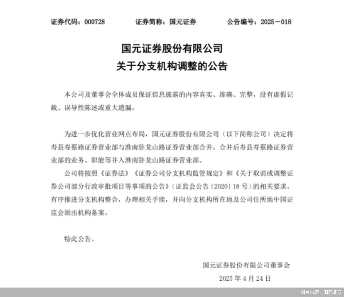 国元证券:进一步优化营业网点布局,将旗下两家营业部合并