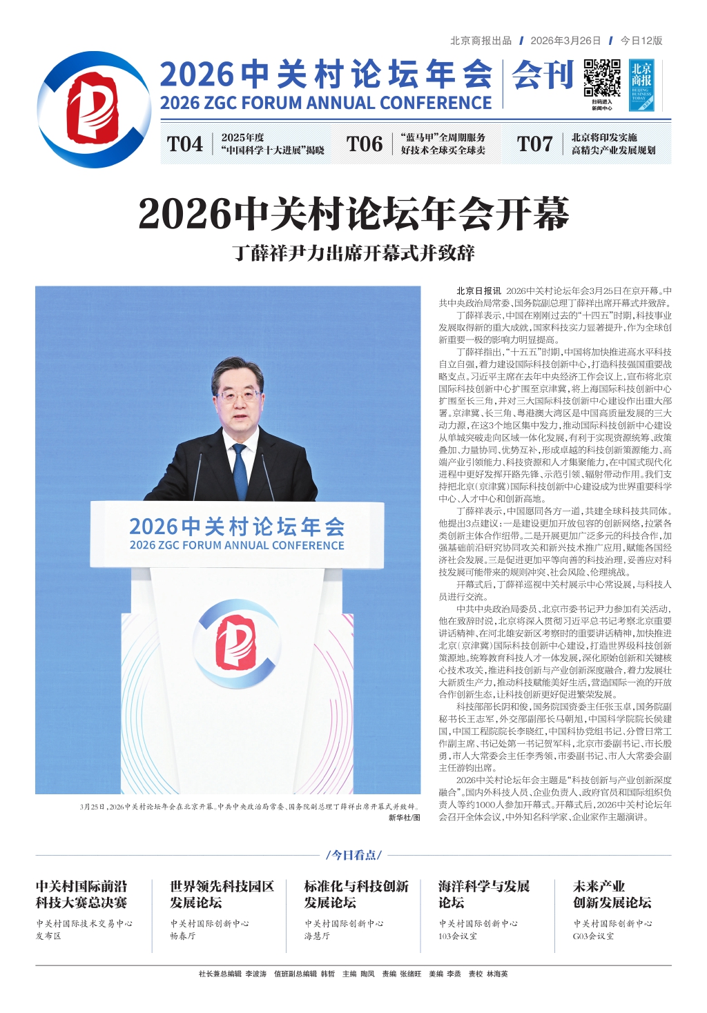 北京日报讯2026中关村论坛年会3月25日在京开幕。中共中央政治局常委、国务院副总理丁薛祥出席开幕式并致辞。